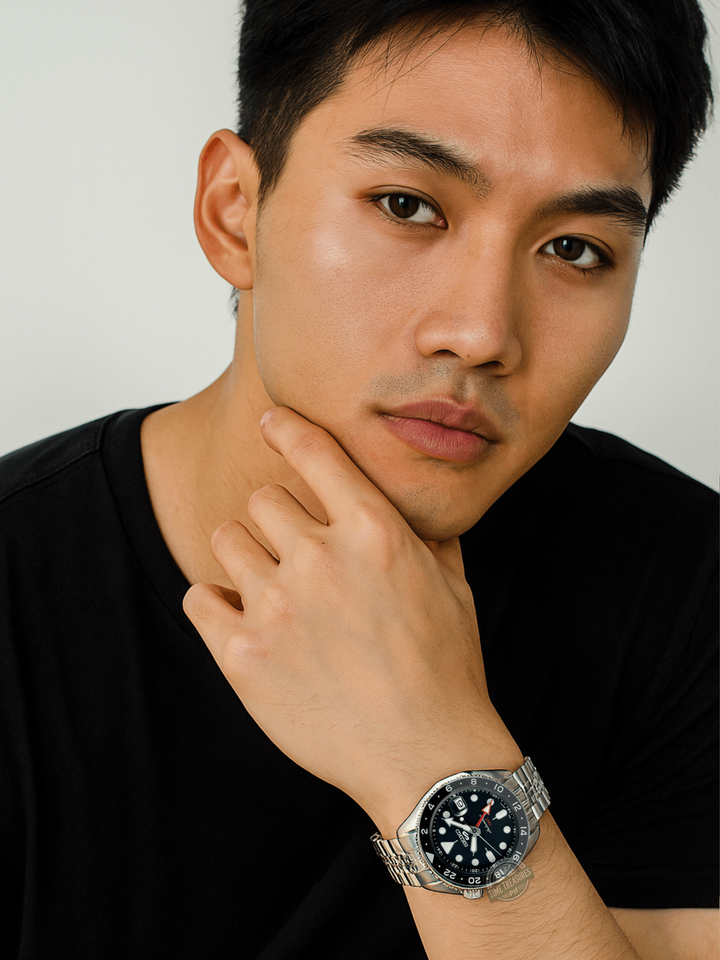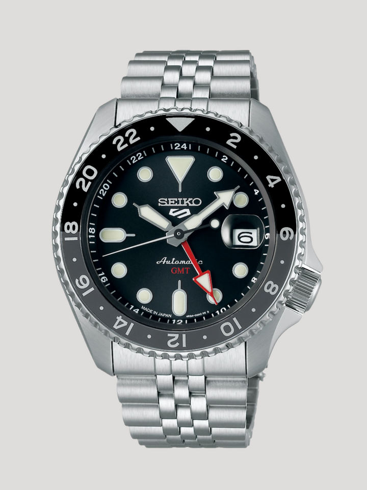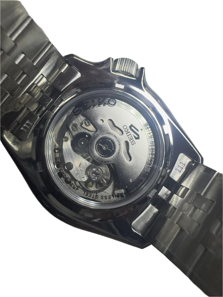 The Seiko 5 Sports GMT SSK001K1 "Bruce Wayne"is a sleek, travel-ready watch with a black dial, black-and-grey bezel, and automatic GMT movement. Built for daily wear with 100m water resistance and a see-through case back showcasing its inner mechanics.