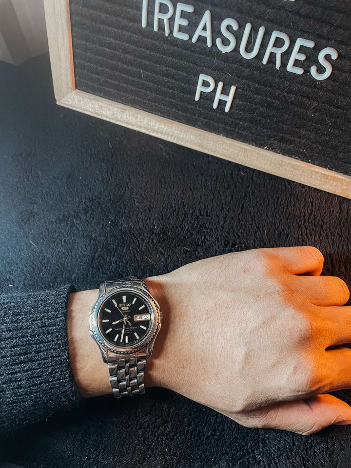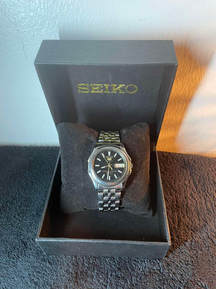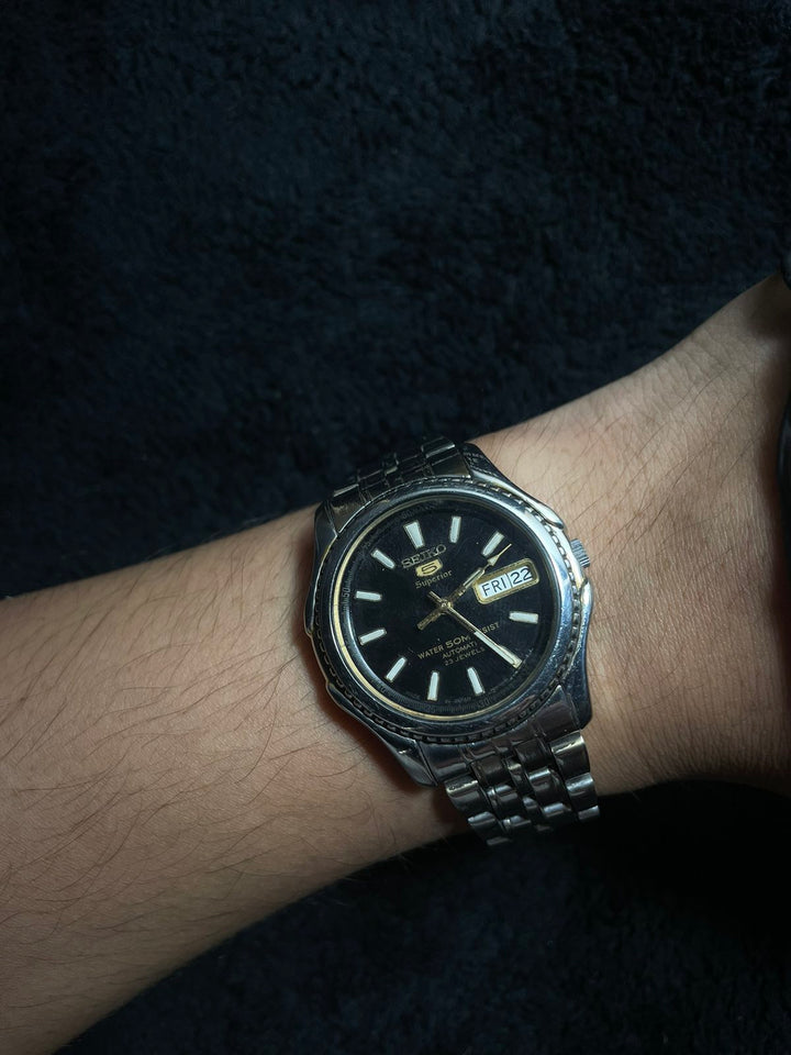 This Seiko 5 Superior Automatic watch showcases a bold black dial paired with a stainless steel case and bracelet, offering a striking yet refined aesthetic. The dial features luminous silver-tone hour markers and hands for enhanced readability, along with a convenient day and date display at the 3 o'clock position. As an automatic timepiece, it is powered by the movement of the wrist, eliminating the need for batteries. The "Water Down Resist" and "21 Jewels" inscriptions emphasize the watch's water resistance and the precision of its movement. Perfect for those who appreciate a blend of functionality, durability, and timeless style, this Seiko 5 Superior is a reliable companion for any occasion.