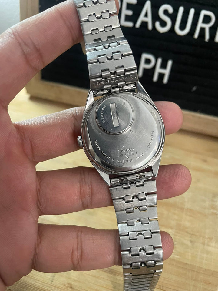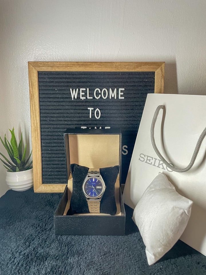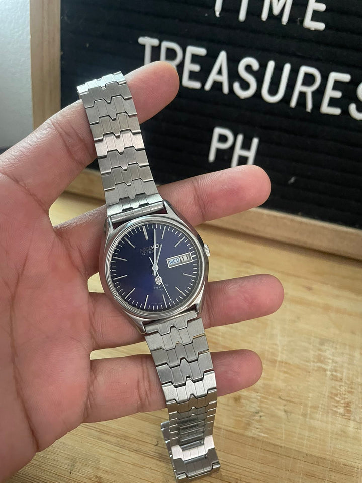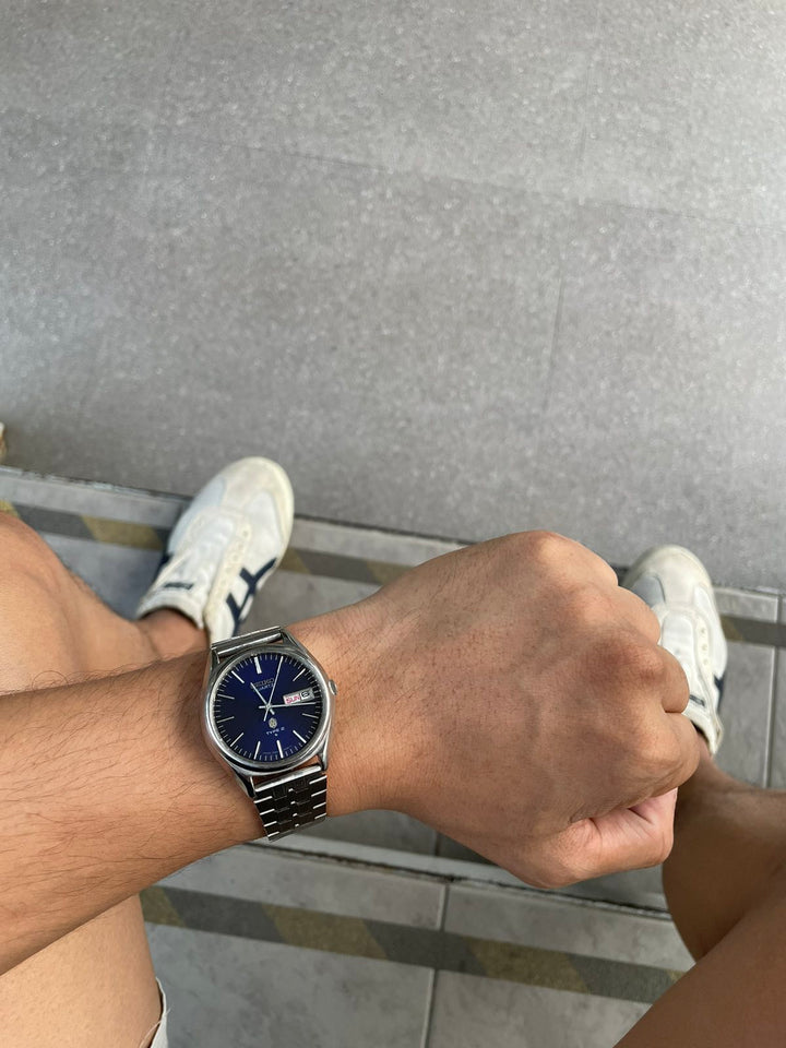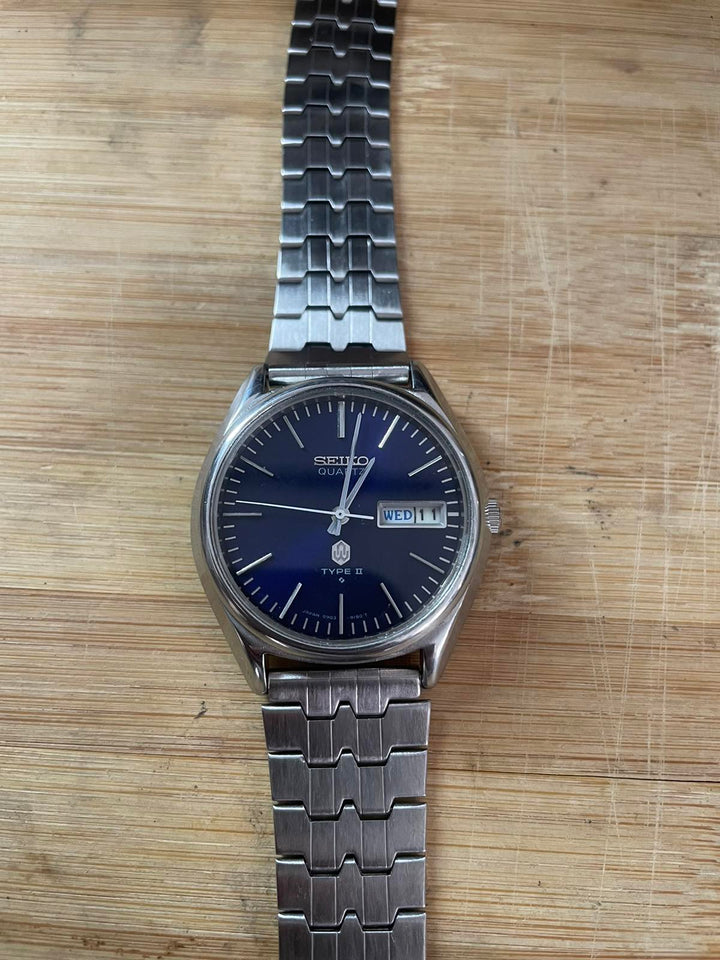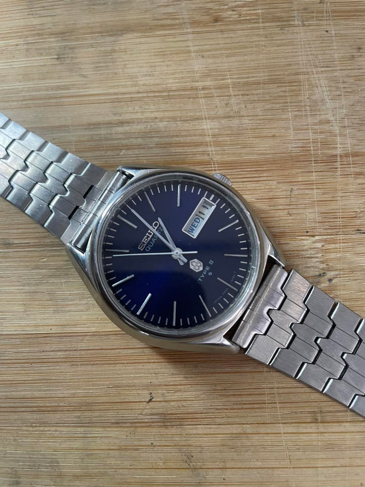 This Seiko Quartz Type II watch features a sleek stainless steel case and bracelet, offering a modern, polished look. The deep blue dial is accented with slim silver-tone hour markers and hands, giving the watch a clean and minimalist aesthetic. A day and date window is situated at the 3 o'clock position for added convenience. The stainless steel bracelet has a unique geometric link design, enhancing the overall elegance of the watch. Powered by reliable quartz movement, this timepiece is both stylish and functional, perfect for those seeking a refined yet everyday wearable watch.